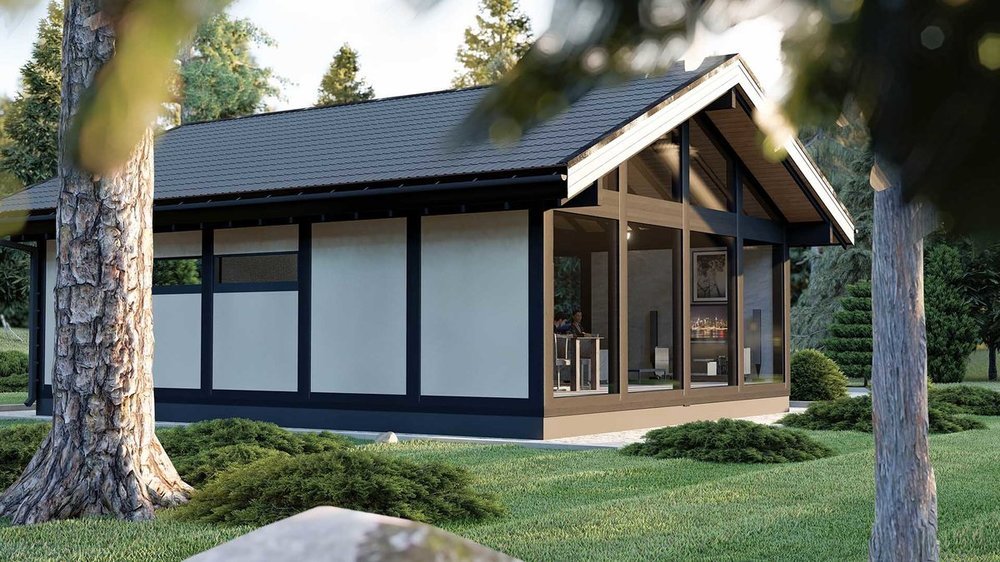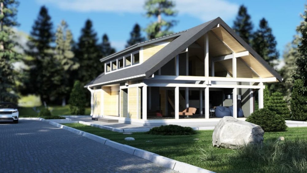 В ряду наших проектов, появился новый проект фахверкового дома на 87 кв.м., который который мы разработали за собственный счет.  Особенности — Объём клеёного бруса 13,7 м²; — Площадь безрамного остекления 32,87 м²; — Площадь застройки 97 м² — 30 железобетонных сваи 200*200 мм — Свободная площадь 87,6 м² (без типовых планировок) — Высота дома 5 метров; — Высота от чистого пола до коньковой балки 4,18 м; — Стойки 240*240 и 240*180 мм (толщина стены 240 мм); — Высота нижнего стеклопакета 2300 мм (