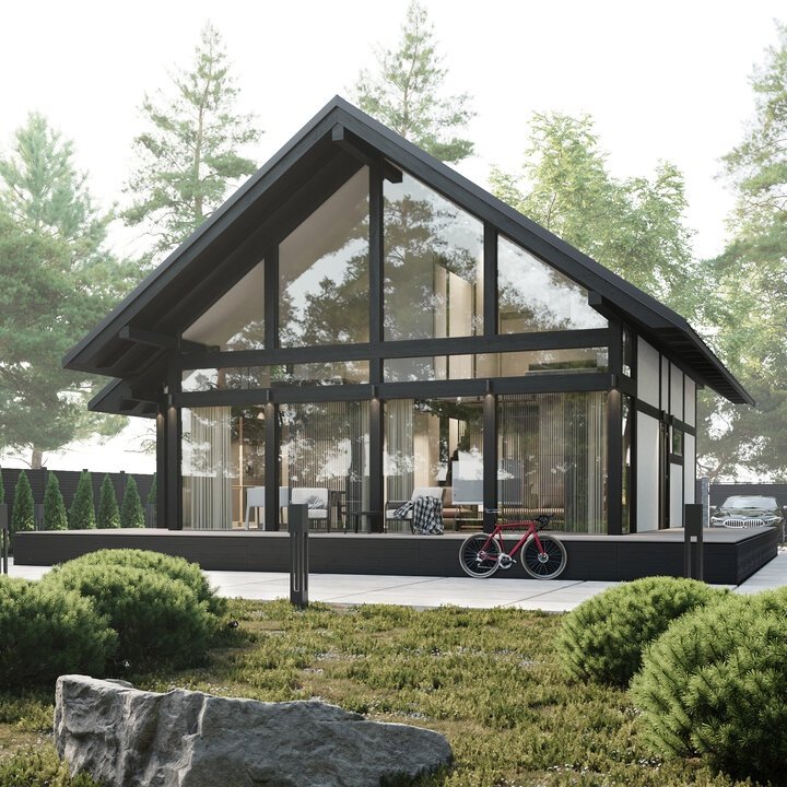 Невероятный проект фахверкового дома Аlpha 50 Загородный дом с возможностью круглогодичного проживания   А-Фрейм Архитектурная форма, в которой доминирует треугольник. Такая форма чаще всего вызывает ассоциацию с буквой «A». Кровля из СИП панелей Чаще всего сип панели являются несущими стенами дома, но у alpha 50 несущим является каркас, а панели используются для внешнего утепления плюс являются элементами жëсткости каркаса. В отличии от ПИРа в металле - нет мостиков холода Фахверк Конструкция,